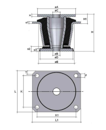 Cone bearing for vehicle cabins with square base is a device designed to reduce vibrations and noise, with a conical shape and a solid square base. Made of natural rubber and galvanized steel, it offers excellent strength and stability. Ideal for cabinets, industrial machinery, and heavy systems, it ensures secure and durable fastening. Available in different hardnesses, it adapts to various applications, ensuring optimal performance in a robust and compact design.